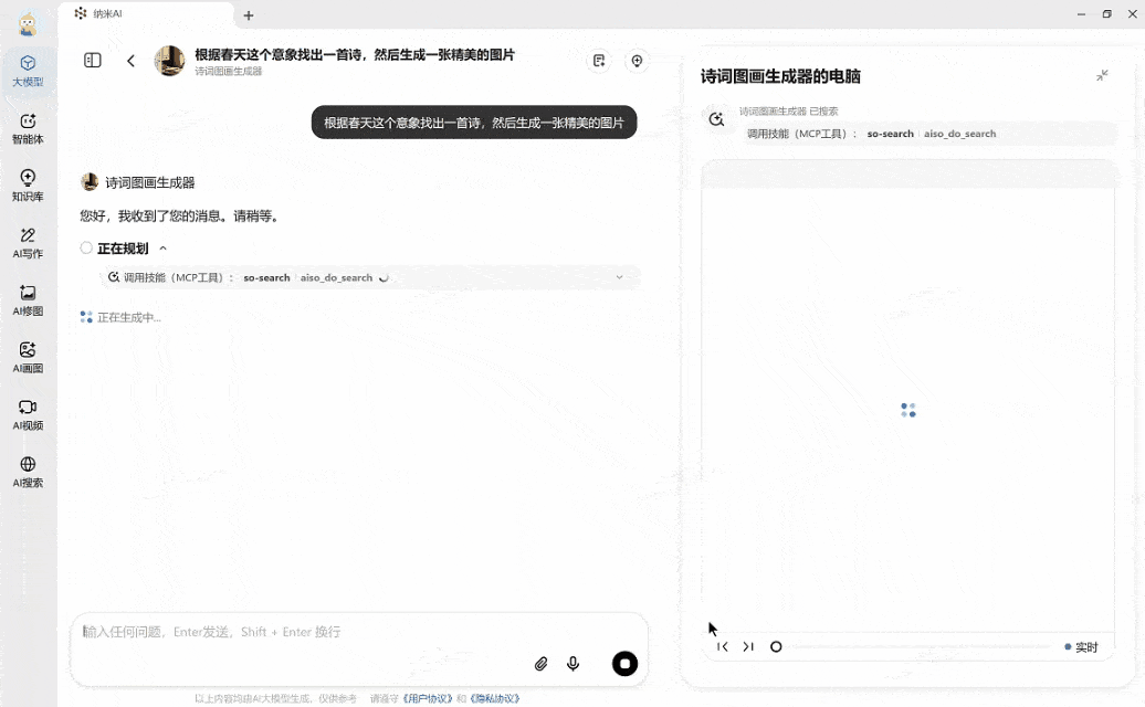 对于小红书博从来说,就能将纳米AI变成「全能使用」了。包罗爬虫东西、AI视频生成东西等正在其他平台付费功能,前段时间。GPT-4o生图掀起了吉卜力热,纳米AI的MCP生态将笼盖更多专业化、碎片化、动态的复杂使命。我们以这个诗词丹青生成器为例。好比,和公共对智能体较为恍惚的认知,这就大大提拔了它们的内容搜刮能力。
